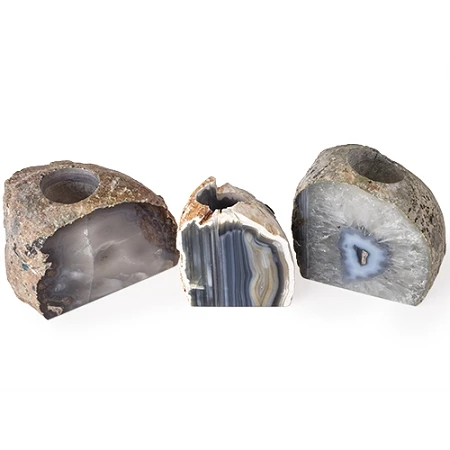 Natural agate slices in a variety of colors. These are natural so color and size will vary from candle holder to candle holder. Work best with real tealight candles, the flame maximizes the glow through the agate slice. Approximate size is 4 inches tall but do vary slightly from holder to holder. case of 6 natural agate candle holders.