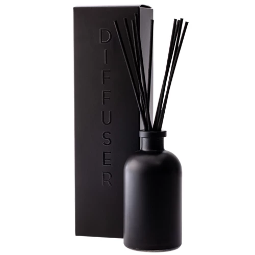 Private Label reed diffusers are packed six diffusers per order. Each private label reed diffuser comes with a black vessel, choice of white or black box, choice of 10 black or white 10 inch felt reeds, 8oz plastic bottle with fragrance and a pouring cap and a collarΒ in the box to hold all components in place. Our private label diffusers are available in over 140 fragrance choices, one fragrance can be selected per case of 6 diffusers.Β The box measures 10.5 inches tall by 3 inches wide 2.5 inches deep and is embossed with the word Diffuser down the front of the box.Β Best place for your custom label is under the word diffuser, best label size is a 2 inch square or 2.5 inches wide by 2 inches tall.Β Black Glass Vessel measures almost 5 inches tall by 2.5 inches wide.