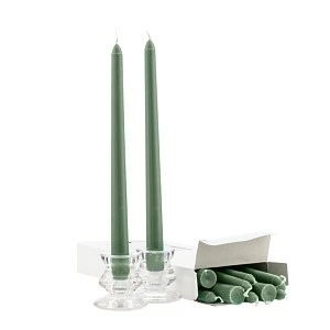 Green taper candles, wholesale case of 144Β green taper candles, they are 10 inch taper candles. They are packed 12 candles to white box with square plastic cut out to view candles. Case hasΒ 12 boxes of 12 taper candles. Taper candles will not drip if burned in a draft free location. Solid color through out the candle, candles are not dipped.Β Great candle for restaurants and weddings.