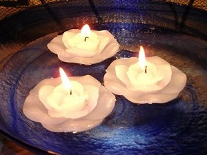 floating candles. Case of 48 white rose floating candles, each floating candle is individually shrink wrapped for protection. Flower floating candle is 4 inches across and will burn up to 5 hours. White rose floating candles are perfect for weddings.